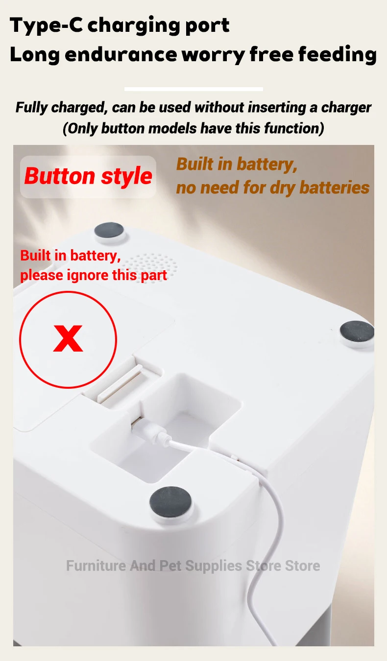 Button style features (without WiFi function): button operation, timed grain dispensing, quantitative grain dispensing, recording function, USB plug/charge standby (built-in battery USB charging, fully charged can be used without plug standby, button style can have 2-4 months of battery life on full charge) (note: body button settings, unable to be remotely operated, can be plugged/charged standby), free USB charging cable