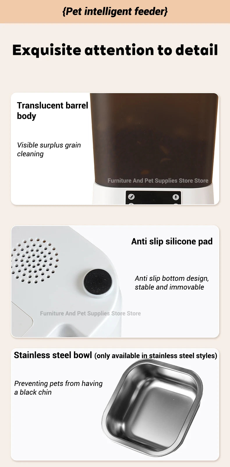 10. Fully detachable, strict control of food hygiene (detachable design, separate design for easy cleaning of grain barrels to solve the owner's problem of food hygiene)