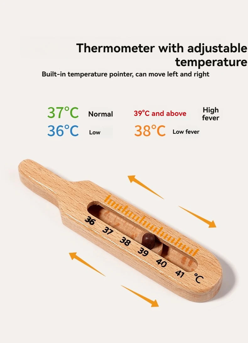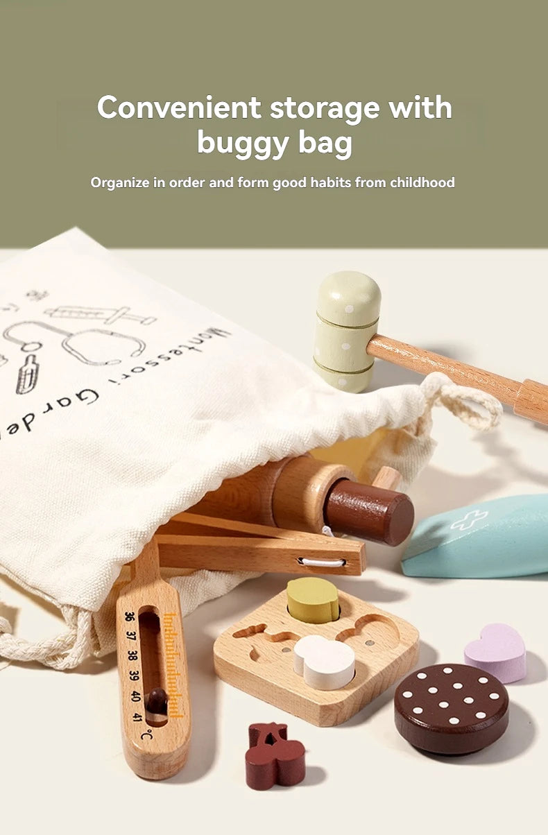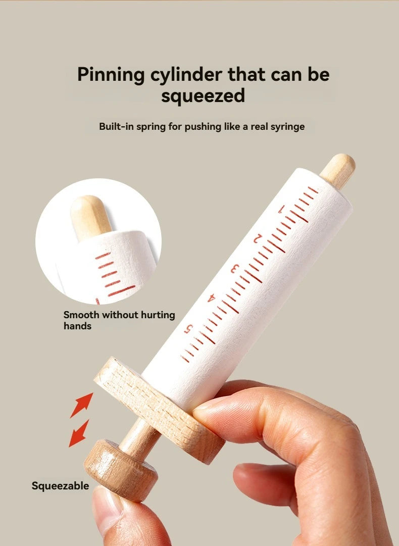 Children playing house simulation, doctors, nurses, stethoscopes, medical kits, syringes, toy sets, wooden boys and girls