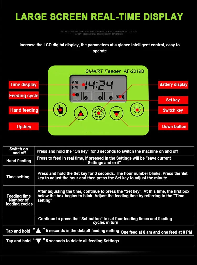 Long press "▲" for 5 seconds to set the default feeding settings: 1 feeding at 8 am, 1 feeding at 8 pm and 5 seconds to delete all feeding settings