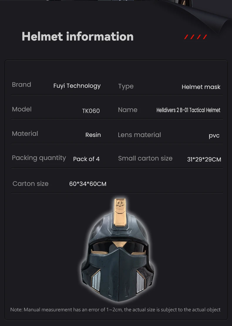 SPECIFICATIONSBatteries Included: NoCarton Size: 60*34*60cmCover Area: Full FaceFeature: Eco-Friendly,Reusable,Breathable,Fashionable,FunnyLens Material: PVCLiner: FlannelMagnetic: NoPacking Quantity: 4PCSProduct Name: Helldiver 2 Federation Hero HelmetProduct Size: 31*29*29cmService: OEM/ODMTheme: Movie & TVWeight: 1.05kgbrand name: FuYimask material: Resinmodel number: TK060occasion: Halloweenplace of origin: Guangdong, Chinaprint method: 6 colorprinting: Digital Printingtype: Party Masks Product Description Brand Name...