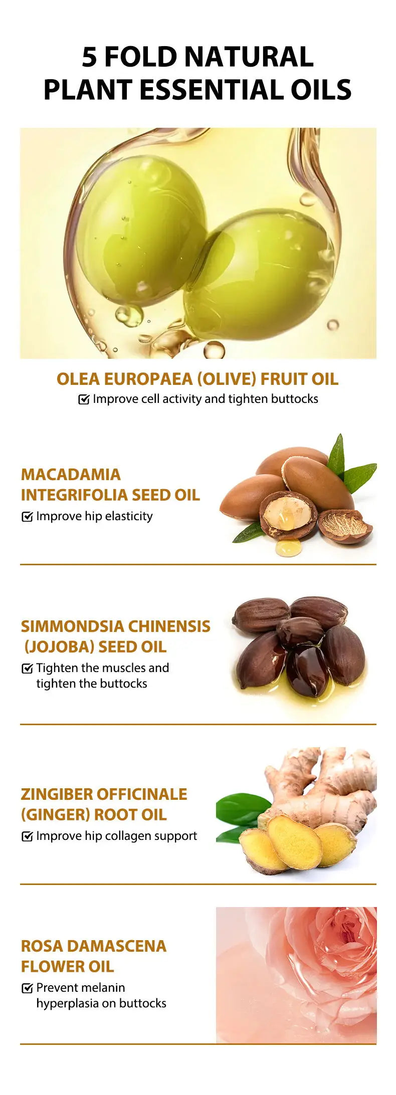 SPECIFICATIONSAdvantage: This essential oil is specially formulated to enhance and shape the buttocks, providing instant lifting, firming, and a sexy massage experience for naturally fuller and shapelier hipsBrand Name: PWYUMAN,PWYUMANCertification: CPNPCountry/Region of Manufacture: CHINAEffect: Give lift to increase the size of the perfect buttocks, activate the buttocks cells, make the...