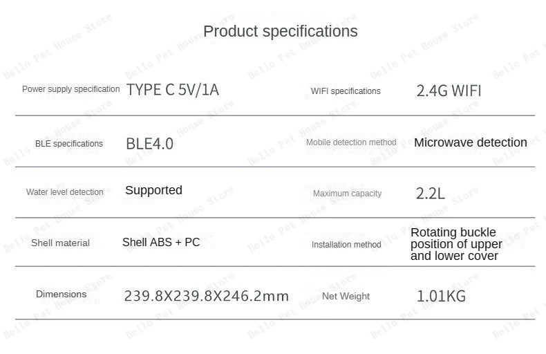 SPECIFICATIONSApplicable objects: dogs and catsBattery Included: NoBrand Name: NoneHigh-concerned chemical: NoneIs Smart Device: YesLCD Display: NoMaterial: PlasticMax Output: 100gMin Output: 50gOrigin: Mainland ChinaPower Source: ChargeSpecification: WhiteType: DogsVolume: 2Lcategory: Pet Smart Drinking Fountaincolor: Basic model, upgraded model with APPpacking list: Product Manual Charging Cable About us I know there are many...