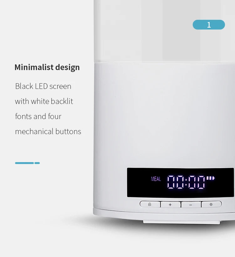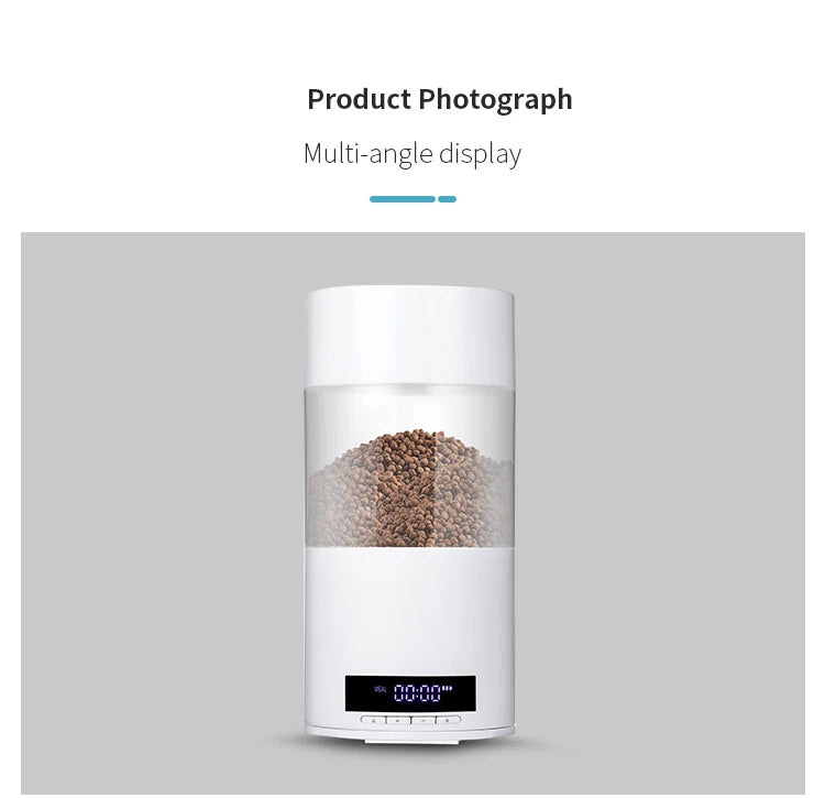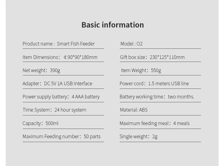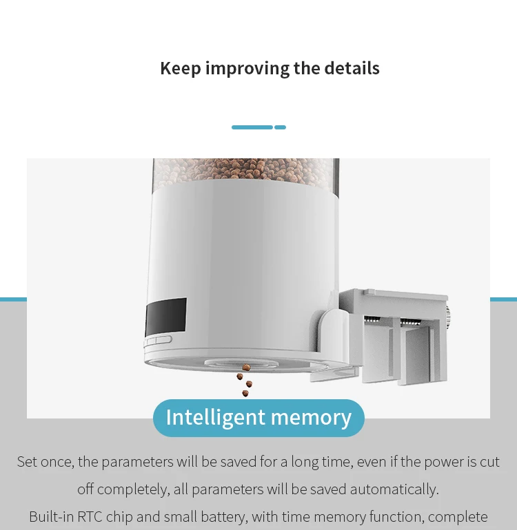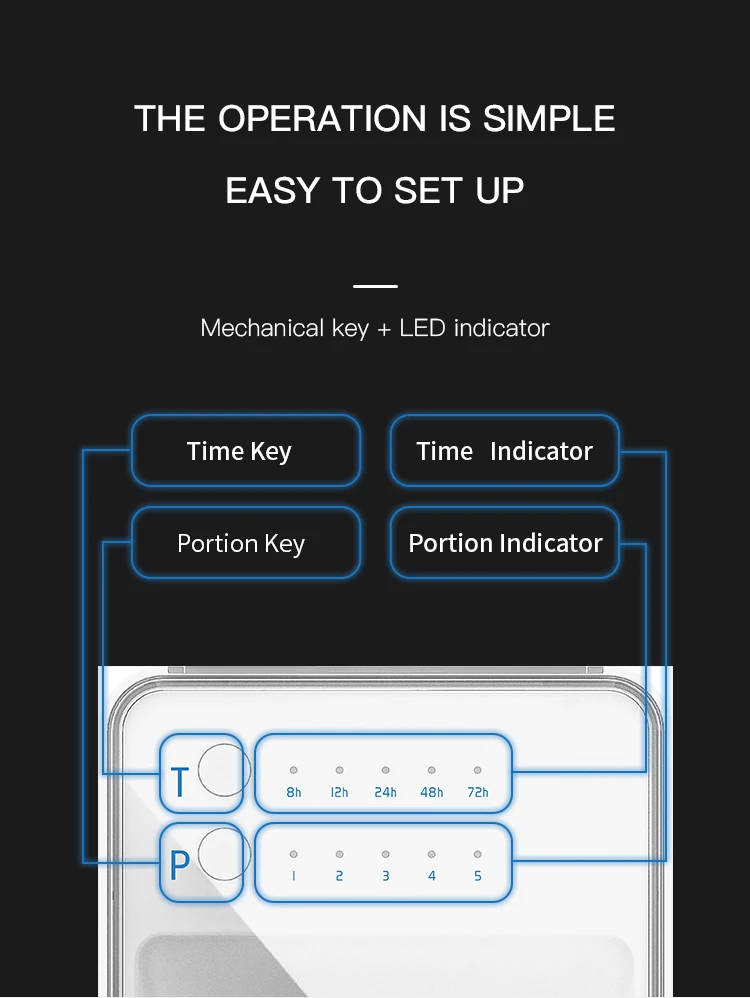 3) 500ml capacity, feeding up to 4 meals a day, each meal can be fed up to 50 servings, each serving is about 2 grams. Each meal time, the weight can be set independently.