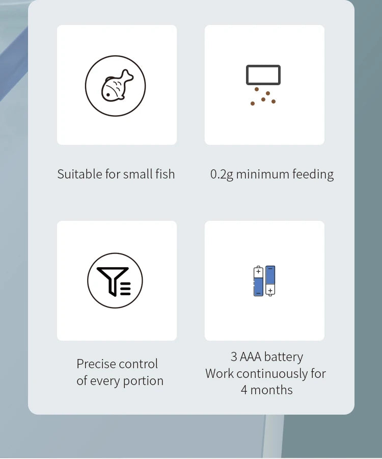 Applicable fish food: powder fish food or round pellet fish food with a diameter of less than 1mm