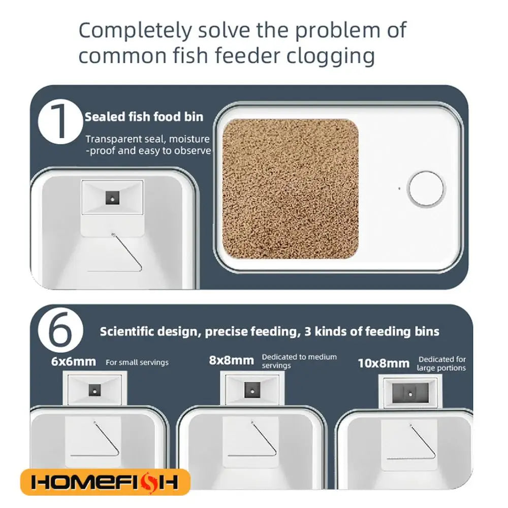Scientific fish feeding, precise rationing, food control, dual anti-blocking, one button feeding. 100ml large capacity, sealed fish food bin, sealed and moisture-proof, transparent design for easy observation. Electric feeding bin, built-in anti-clumping device, spring device pulls the flap thimble, along with opening and closing the feeding bin push and pull back and forth to loosen the fish food without clumping. Cellphone remote monitoring, multi-segment timing, remote viewing of feeding records, lack of food to remind.